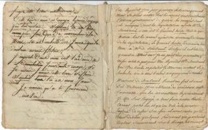 Manuscrit (incomplet du début), [1795] ; cahier de 46 pages petit in-4 (16 x 20 cm) écrit par deux mains successives (p. 1-6, et p. 7-46), avec ratures et corrections (qqs petites déchirures, qqs ff. détachés du cahier).