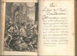 Recueil de considérations sur l’Avent, le jour de Noël, le jour de la Circoncision, l’Épiphanie, le temps de Carême, etc., illustré de 12 gravures dont 11 hors-texte insérées dans le manuscrit ; en fin de volume, portrait gravé de l’auteur probable, curé de Sancy, et oncle du possesseur. En tête et à la fin, on a ajouté des pages d’une autre main : ex-dono à Marie-Anne-Claude Monmarqué, femme de Nicolas Henry Lesguillon, maître chirurgien, par Joseph Lenety, prêtre de Notre-Dame de Sancy, diocèse de Meaux, 1752, vers et sentences…