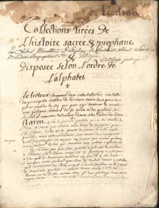 Encyclopédie des « principales matières de l’écriture sainte, tant pour ce qui en regarde la foy que pour ce qui concerne la morale », avec citations tirées de la Bible et de commentateurs : articles consacrés à une grande variété de sujets : « Aaron », « Absolution », « Abstinence », « Adultère », « Âme », « Ami », « Ami infidèle », « Ami de table et interressé », « Amour de Dieu envers l’homme », « Amour des hommes envers Dieu », « Amour qu’il faut avoir pr le prochain », « Amour des ennemis », « Amour réciproque », « Amour-propre », « Amour du Monde, profane & criminel », « Anges », « Artisans », « Astrologie », « Aumône », « Avarice », etc., jusqu’à « Faux zèle » et « Zelotipie ou jalousie qui fait douter si une femme est adultère »… Ex-libris manuscrit du monastère bénédictin de Saint-Étienne de Fontenay [à Saint-André-sur-Orne (Calvados)].