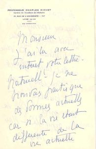 RICHET fils (Charles). (1882-1966) médecin. L.A.S., 10 juillet 1954 ; 3 pages et demie in-8 à son en-tête.