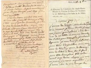 [Vers 1811], à Adélaïde Dufrénoy. Il a cru que le rouleau de romances emporté par mégarde appartenait à sa chère muette, mais d’après ce que dit Laya, chez qui ils dînent ce soir, il suppose qu’elles sont à elle. « Je me fais une veritable fête de dîner avec vous chez votre aimable et cher cousin. […] J’ai vû, ce matin, Mr Renaud de l’École polytechnique qui m’a dit un grand bien de votre charmant fils »… 8 avril 1812, à Antoine Jay. Il a perdu sa lettre annonçant l’arrivée de « la barrique de vin que votre genereuse amitié a absolument exigé que j’acceptasse en pur don », et hier soir, a reçu un avis de livraison recommandant de ne la recevoir « qu’après avoir vérifié le vin »… 16 octobre [1812], au même. Il trouve son Glaneur et envoie quatre billets pour son « plus prochain exercice ». « Je n’ai pas oublié, mon cher compatriote, que vous m’aves promis de faire connoître ma methode au public. En conséquence je me propose de vous communiquer les petits écrits que j’ai publiés et qui serviront à vous la faire connoître. Je serai même très aise que vous en rendies compte dans le Journal de Paris »…