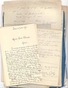 Cahier de relevés, croquis et notes d’expériences concernant les corpuscules d’oxyde de fer magnétique, dans les poussières atmosphériques et dans les sédiments terrestres, pendant son séjour à Sainte-Marie du Mont (Manche). On joint un ensemble de notes autogr. et un fragment de manuscrit a.s. sur les poussières métalliques, 1870-1871 ; une liste de ses notes dans les comptes rendus de l’Académie des sciences ; 2 l.a.s. à lui adressées par Émile Yung et une de G.A. Daubrée (1876). Plus un exemplaire du livre de Gaston Tissandier, L’Océan aérien. Études météorologiques (Paris, G. Masson), et 11 tirés à part d’articles.