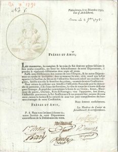 VALENCIENNES. L.S. par 6 membres du Comité de surveillance & de correspondance de la Société des Amis de la Constitution, Valenciennes 21 décembre 1791, à leurs frères et amis de la Société des Amis de la Constitution à Poitiers ; 1 page...