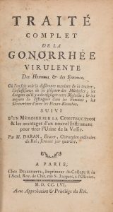 - DARAN (Jacques). Traité complet de la gonorrhée virulente des hommes & des femmes... À Paris, chez Delaguette, 1756. In-12, veau marbré, dos à nerf et fleuronné (reliure usée, pièce de titre manquante. Petite déchirure sans manque à une planche, quelques rousseurs sans gravité).