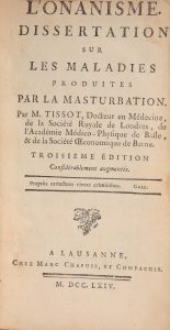 - TISSOT (S.A.). L'onanisme. Dissertation sur les maladies produites par la masturbation. À Lausanne, chez Marc Chapuis, 1764. In-12, basane havane, dos à nerfs et fleuronné, pièce de titre rouge.