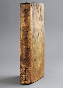 (qq. taches et petit accroc au bord du plat inf., garde sup. manquante, papier un peu jauni, mouillure pâle aux derniers f., accroc en marge p.89).