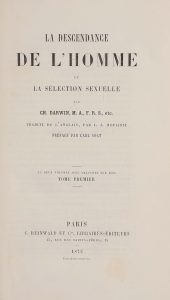 Première édition française, traduite par Moulinié, revue sur la dernière édition anglaise par Barbier et préfacée par Carl Vogt. Pour établir sa théorie, selon laquelle l'homme descendrait d'un organisme moins parfait que lui, Darwin compare l'évolution du développement des embryons humains à ceux des animaux inférieurs.