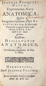 On trouve dans ce petit traité la première description des veines lactées qui amènent le chyle au réservoir (réservoir ou citerne de Pecquet). Rappelons aussi que c'est en 1647, alors qu'il était encore étudiant à Montpellier, que Pecquet (1622-1674) fit, par hasard, la découverte du canal thoracique. Cette découverte mit fin aux objections qui étaient faites contre la théorie de Harvey et porta un dernier coup aux adversaires de la " circulation ", en tête desquels Riolan.