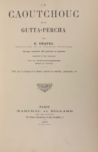 CHAPEL (E.). Le caoutchouc et la gutta-percha. Paris, Marchal & Billard, 1892. Grand in-8, XIII, (1bl), 601, (1bl)pp., demi-chagrin bordeaux, dos à nerfs. (Rel. de l'ép.) (charnières fragiles, dos frotté). Première édition. Nombreuses figures...