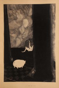 Tirage comprenant une suite des 12 magnifiques compositions de Paul Iribe. Un des 2 000 exemplaires avec les illustrations sur papier pelure contrecollées ; celui-ci, non justifié, porte le tampon d'Iribe indiquant " hommage de l'auteur ". Cet ouvrage étonnant comporte plusieurs critiques de la part de l'illustrateur Paul Iribe (1883-1935) : la première d'entre elles est une charge contre le cubisme, manifeste dès la première planche qui figure la mort, " regrettable d'ailleurs ", de la magicienne Circé, qui avait métamorphosé les compagnons d'Ulysse en pourceaux. " Circé incarne pour Iribe la ligne courbe et l'esthétique fin-de-siècle au sein de laquelle il fit œuvre, le cochon l'expansion déraisonnée de la géométrie et du cubisme qu'il abhorre " ; l'album est par ailleurs dédié " A Sircé ". Réalisé au retour des États-Unis, La mort de Circé sonne également le glas de l'aventure hollywoodienne et de la collaboration avec le réalisateur Cecil B. DeMille ; Iribe démontre son ressentiment à l'égard des américains et mais également, tel Ulysse qui rentre de son Odyssée malheureuse, à bord du paquebot " l'Île est Vilaine "- comprendre Manhattan - envers sa Pénélope qu'il retrouve endormie auprès de son amant.