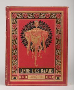 représentants des plumes de paons, plats encadrés de filets dorés et d'un cadre noir floral, ornés d'une tête d'éléphant au centre des plats, tranches dorées, (reliure de l'éditeur Hachette, signée A. Souze) (une charnière fendue, début de fente à l'autre).