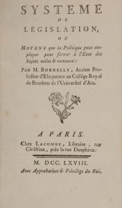 BORRELLY (Jean-Alexis). Système de législation, ou Moyens que la politique peut employer pour former à l'État des sujets utiles & vertueux. Paris, Lacombe, 1768. In-12, VIII-158-[2] pp., veau moucheté, dos lisse orné, pièce de titre (rel. de...