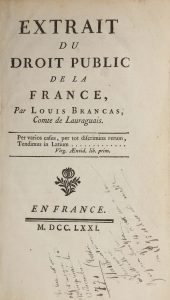 BRANCAS DE LAURAGUAIS (L.-L.-F. de). Extrait du droit public de la France. En France, 1771. In-8, [2]-138 (dont XII) pp., veau fauve marbré, dos lisse orné, fleurons dorés, pièce de titre, roulette dorée sur les coupes, tranches rouges (rel. de...