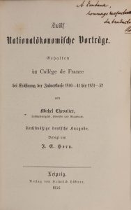 CHEVALIER (Michel). Zwölf nationalökonomische Vorträge. Gehalten in Collège de France bei Eröffnung der Jahreskurse 1840-1841 bis 1851-1852. Rechtmässige deutsche Ausgabe. Besort von J. E. Horn. Leipzig, Verlag von Heinrich Hübner, 1856....