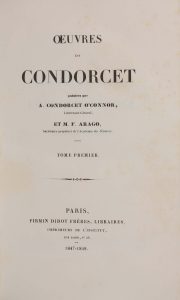 Édition originale de la meilleure collective de Condorcet, devenue au demeurant extrêmement rare : l'un des éditeurs, Arthur Condorcet O'Connor (1763-1852) était le gendre posthume du philosophe, ayant épousé en 1807 sa fille unique Louise-Sophie-Alexandrine Caritat de Condorcet (1790-1859). Quant à François Arago, il s'est chargé de la partie scientifique de l'ouvrage.