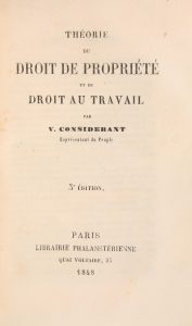 CONSIDÉRANT (Victor). Théorie du droit de propriété et du droit au travail. 3e édition. Paris, Librairie phalanstérienne, 1848. In-16, 36 pp., cartonnage Bradel de papier bouteille, dos lisse orné de filets dorés (reliure moderne) (légères...