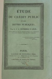 DUFRESNE DE SAINT-LÉON (Louis-César-Alexandre). Etude du crédit public et des dettes publiques. Paris, Bossange Père, 1824. In-8, [4]-III-285 pp., bradel demi-percaline verte à coins, dos orné, couv. cons. (reliure postérieure) (épidermures)....