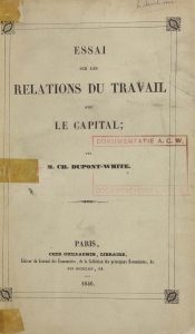 DUPONT-WHITE (Charles Brook). Essai sur les relations du travail avec le capital. Paris, Guillaumin, 1846. In-8, 444 pp., demi-chagrin brun, dos à nerfs, couv. cons. (Laurenchet). Cachet humide. Édition originale. (Coquelin et Guillaumin, I, 625).