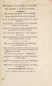- Situation actuelle de la France, qui comprend les chapitres suivants : Comparaison des provinces et de la capitale ; plan de conciliation entre les trois ordres ; avantages et inconvénients de la nouvelle division du royaume ; création d'un nouveau signe hypothéqué avec privilège sur les fonds de terre ; vice du plan de M. Necker et des assignats du clergé ; moyen de détruire ce vice et l'agiotage, et de liquider tous les papiers que l'on va créer.