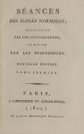 I. Le décret de la Convention Nationale du 9 brumaire an III [30 octobre 1794], dit décret Lakanal, avait créé l'École Normale centrale, point culminant d'un nouveau système éducatif et dont la finalité était de former, en trois mois, des professeurs destinés ensuite à retourner dans leurs provinces d'origine diffuser connaissances positives et " lumières ", lutter contre l'ignorance et la " superstition ", dans le cadre des écoles normales de district, également instituées par le même décret. Donnés dans l'amphithéâtre du Jardin des Plantes, les cours s'ouvrirent le 1er pluviôse an III [20 janvier 1795] en présence de Lakanal, et furent dispensés par les plus grandes sommités scientifiques de l'époque, dont Laplace, Haüy, Monge, et Lagrange. Ils portèrent essentiellement sur des matières de physique et de mathématiques. Ces cours (" Séances ") et les questions des élèves (intitulées " Débats ") étaient notés sur place par des sténographes, puis imprimés le jour suivant sous forme de cahiers que l'on distribuait à l'entrée du cours. C'est le recueil factice de l'ensemble de ces cahiers qui constitue la " première édition " de cette série, selon un emploi dérivé du terme qui a également servi pour les Provinciales, mais qui est entré désormais dans l'usage. Actuellement, l'on ne connaît que deux exemplaires complets des leçons et débats sous cette première forme.