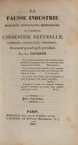 FOURIER (Charles). La Fausse industrie morcelée, répugnante, mensongère, et l'antidote, l'industrie naturelle, combinée, attrayante, véridique, donnant quadruple produit. Paris, Bossange, l'auteur, 1835-1836. 2 vol. in-8, pagination multiple...