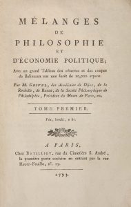 GRIVEL (Guillaume). Mélanges de philosophie et d'économie politique ; avec un grand tableau des réserves et des coupes de baliveaux sur une forêt de 10,000 arpens. Paris, Batilliot, 1793, 2 vol. in-8, XVI-463 et [4]-VIII-562-[2] pp., avec un...
