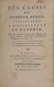 GROS DE BESPLAS (Joseph-Marie). Des Causes du Bonheur Public. Ouvrage dédié à Monseigneur Le Dauphin, Par M. l'Abbé Gros de Besplas, de la Maison & Société de Sorbonne, Prédicateur du Roi, &c. À Paris, De l'Imprimerie de Sébastien Jorry,...