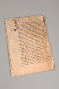 Minute extrait d'un acte de Jean de Bourbon (Johannes de Bonobonio) en qualité d'administrateur de l'archevêque de Lyon, son neveu Charles de Bourbon, reconnaissant une fondation perpétuelle, créée par Philibert Sotison, notaire public, procureur général des terres de Bourgogne et habitant de Villefranche (" Philibertus Sotisonis notarius publicus procurator generalis terre belli burgensisque et habitator Villefranche… "), en l'église paroissiale de " Notre-dame des Marez " ; acte passé par devant Jean Batonari " de Bello Regardo " notaire de Lyon, le 5 janvier 1452.