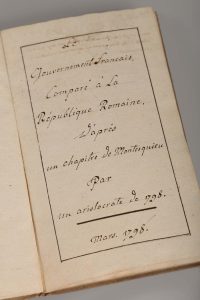 [Manuscrit]. Le Gouvernement français, comparé à la République romaine, d'après un chapitre de Montesquieu. Par un aristocrate de 1798. S.l., mars 1. In-12, 65 pp., couverts d'une fine écriture cursive à l'encre brune, fort lisible, papier...
