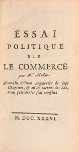 [MELON DE PRADOU (Jean-François)]. Essai politique sur le commerce. Nouvelle édition augmentée de sept chapitres, et où les lacunes des éditions précédentes sont remplies. S.l., 1736. In-12, [4]-399 pp., veau brun, dos orné à nerfs, tranches...