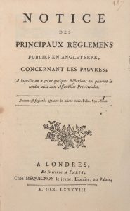 [Paupérisme]. Notice des principaux règlemens publiés en Angleterre, concernant les pauvres ; à laquelle on a joint quelques réflexions qui peuvent la rendre utile aux Assemblées Provinciales. À Londres & Paris, chez Méquignon le jeune, 1788....