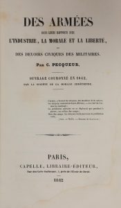 PECQUEUR (Constantin). Des Armées, dans leurs rapports avec l'industrie, la morale et la liberté, ou Des Devoirs civiques des militaires. Ouvrage couronné en 1842 par la Société de la morale chrétienne. Paris, Capelle, 1842. In-8, [4]-VIII-284...