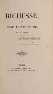 Seconde édition, complétée, de ces dissertations qui avaient au départ paru sous forme de fascicules (chez Verdière) de 1829 à 1830. Jean-Antoine Robert-Guyard, né à Bar-le-Duc, disciple fort oublié de Jean-Baptiste Say, est l'inventeur de ce terme de " ploutonomie " (science des richesses), qui ne prit pas dans le vocabulaire économique.