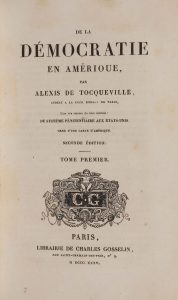 TOCQUEVILLE (Alexis Clérel de). De la Démocratie en Amérique. Paris, Librairie de Charles Gosselin, 1835-1840 4 vol. in-8, [4]-387 pp., [4]-447 pp., [4]-V-[3]-333 pp. et [4]-363 pp., avec une carte dépl. aux contours rehaussés de couleurs à la...