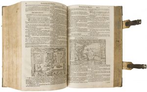 Exemplaire enrichi entre le feuillet 14 et le début de l’ancien testament, du livre de l’exode en 35 feuillets, provenant d’un autre exemplaire. Il est illustré de 17 grandes gravures sur bois dont 16 signées D.R. désignant problablement le graveur et aquafortiste David Reninger.