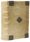 (8 ff.). Peau de truie sur ais de bois, plats ornés d’un décor à froid composé de fers et de roulettes en encadrement, bouillons et ombilic en métal repoussé présentant un décor de feuillage et de fleurs, dos à nerfs, tranches anciennement bleues, fermoir en peau de truie et métal ciselé (reliure allemande de l’époque).