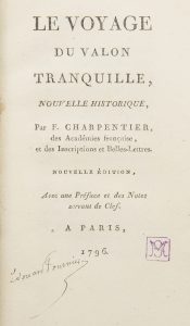 CHARPENTIER (François).Le Voyage du valon tranquille, nouvelle historique. Paris : Chardin, P. F. Aubin, 1796. — In-12, (1 f.), xxiij, 112 pp., (1 f.), 32 pp., (2 ff.). Demi-veau havane à coins, filets dorés, dos lisse orné, tranches dorées...