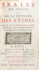 Édition originale de cet ouvrage de l’abbé Claude Fleury (1640-1723), fruit de sa riche et longue expérience en tant que gouverneur des princes de Conti. Cet ouvrage revêt plus d’un intérêt, à la fois vive critique des méthodes en usage à l’époque et réflexion sur les méthodes à introduire dans le système éducatif.