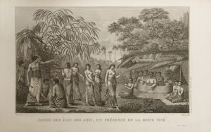 L’atlas qui vient illustrer cette relation est composé, en premier tirage, d’une grande carte dépliante De la mer des Indes et d’une partie de celle du Sud dressée par J.D. Barbié du Bocage gravée par François d’Houdan, et de 43 surperbes planches représentant les indigènes des îles des Amis, de Nouvelle Zélande, des îles Fidji, etc. ainsi que des vues, des plantes et des animaux. Les vues et les représentations des indigènes ont été gravées par Jacques-Louis Copia d’après Piron, les animaux par Jacques-Louis Pérée et Pierre Maleuvre d’après Piron et Jean Baptiste Audebert et les planches de botaniques par Pérée d’après Piron et surtout Pierre-Joseph Redouté.