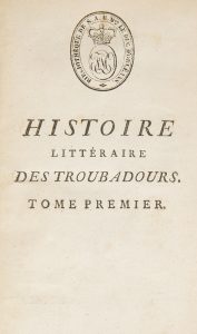 LA CURNE DE SAINTE-PALAYE (Jean-Baptiste de). Histoire littéraire des troubadours, contenant Leurs vies, les extraits de leurs pièces, & plusieurs particularités sur les mœurs, les usages, & l’histoire du douzième & du treizième...