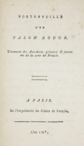 [MARIE-ANTOINETTE]. Porte-feuille d’un talon rouge. Contenant des Anecdotes galantes & secrestes de la cour de France. Paris : de l’imprimerie du comte de Parades, [vers 1780]. — Petit in-8, 156 x 112 : 42 pp., (1 f. blanc). Veau marbré, dos...