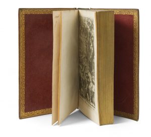 parties en un volume in-8, 192 x 113 : (24 ff.), 352, 64 pp., (16 ff. dernier blanc). Maroquin rouge, triple filet doré en encadrement et fleuron doré aux angles sur les plats, dos à nerfs orné, doublures de maroquin rouge ornées d’une dentelle dorée en encadrement, tranches dorées sur marbrure (reliure de l’époque).