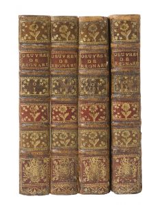 Charmante édition fort bien imprimée des œuvres de l’auteur dramatique Jean-François Regnard (1655-1709). Elle est illustrée de 4 charmantes vignettes de titre, différentes à chaque tome, finement gravées en taille-douce par Fessard d’après P. Clavareau.Bon exemplaire aux dos mosaïqués, alternant des caissons de maroquin rouge et brun, portant en queue des armes non identifiées.