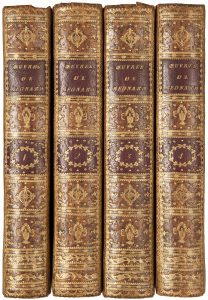 Bel exemplaire sur beau papier, dans une reliure au dos richement orné. Manque partiel aux coiffes supérieures des tomes I et III, charnières fendillées et quelques égratignures.