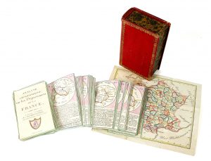 ANALYSE GÉOGRAPHIQUE, SUR LES DÉPARTEMENS DE LA FRANCE. Paris : Bourrut-Lemeri, [1819]. — 90 fiches cartonnées (131 x 79) et une carte dépliante, placées dans une boîte d’édition imitant un livre, recouvert de papier maroquiné rouge avec...