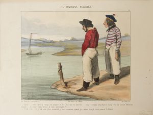 DAUMIER (Honoré). Les Canotiers parisiens. Paris : Aubert, [1840]. — Suite de 19 lithographies sur blanc, en feuilles (271 x 349), sur les 20 de la série des Canotiers parisiens. Il manque la planche 1. Planche 19 brunie, quelques rousseurs....