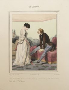 •Les Lorettes. Paris : Aubert, [1841-1843]. — 79 planches en feuilles (331 x 248), lithographiées sur blanc, coloriées et gommées à l’exception des planches 55 et 67 en tirage en noir du Charivari.- Planches pour L’Artiste. Paris, s.d. — Ensemble d’un portrait de Gavarni et de 75 lithographies sur blanc, 288 x 215 pour la majorité, certaines sur papier de chine collé, publiées par le journal L’Artiste. Quelques rousseurs.