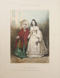 •La Vie de jeune homme. Paris : Aubert, [1840-1841]. — Suite complète des 36 lithographies sur blanc de cette série, en feuilles (340 x 255), conservée dans une reliure de réemploi en demi-basane verte portant au dos le titre de la série.