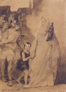 JOHANNOT (Alfred). L’Énéide.,1832Dessin au lavis, rehaussé d’une pointe de gouache. Signé en bas à gauche.9,2 x 6,8 cm Charmante composition réalisée pour l’illustration des Œuvres de Jacques Delille publiée par Furne en...