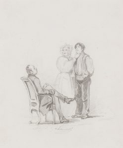 JOHANNOT (Alfred). La Présentation Dessin à la mine de plomb, signé en bas à gauche. 13 x 10,8 cm Dessin à la mine de plomb représentant trois personnages. Il s’agit probablement d’un dessin préparatoire pour l’illustration de la...